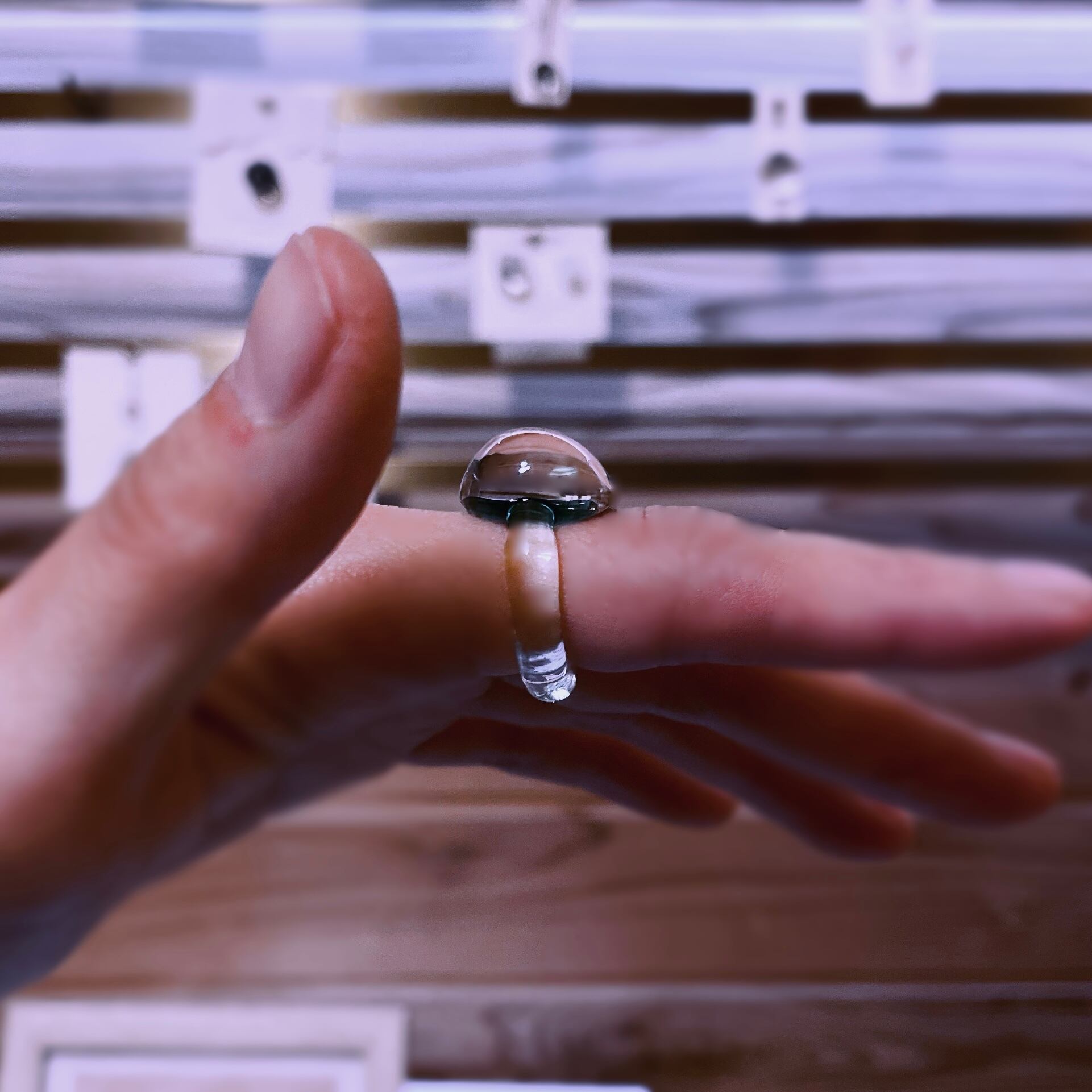 弾力や透け感のある"お菓子のグミ"をイメージして仕上げたガラス製のリングです。手にちょこんとのる半円型のグミがとても可愛く、手元を輝かせてくれます。素材はボロシリケイトという硬質ガラスでできており、炎の中でじっくり溶かして手作業で形を作ります。