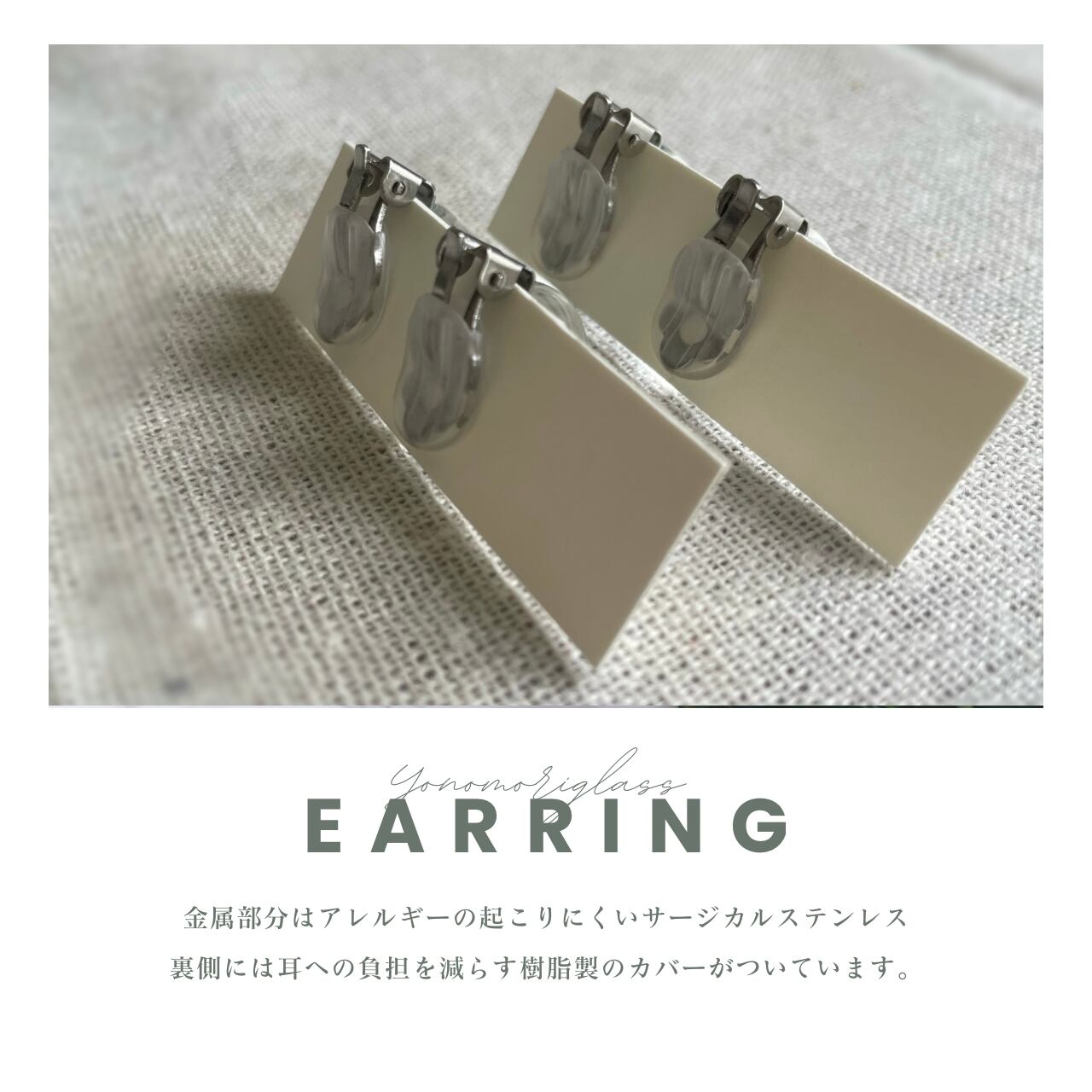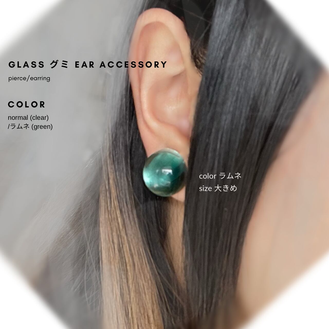 弾力や透け感のある"お菓子のグミ"をイメージして仕上げたガラス製のイヤリングです。半円のグミ型がコロンと耳元を輝かせてくれます。素材はボロシリケイトという硬質ガラスでできており、炎の中でじっくり溶かして手作業で形を作ります。正面ではよりラムネ色が濃く、側面ではより透明感が際立つユニークなイヤリングです。