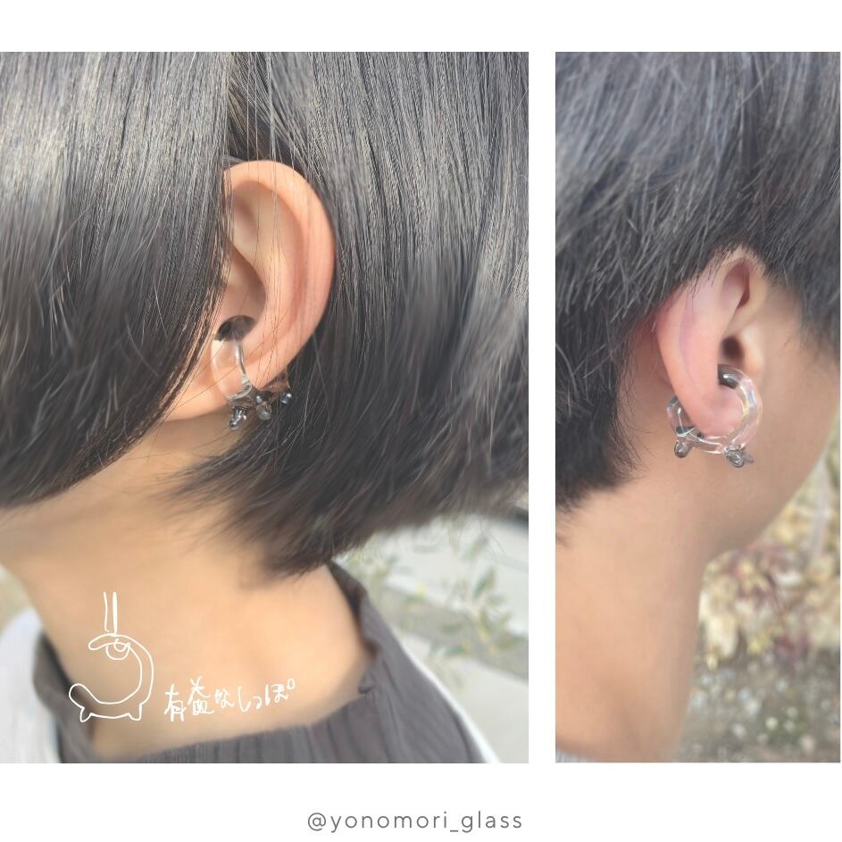 トカゲのイヤーカフ。イヤーカフに足が生えたような形。トカゲの置物としても楽しめます。素材には、軽量で耐久性に優れた”硬質ガラス”を使用しております。硬質ガラスは水や熱、薬品に強くどんなシーンにもマッチいたします。